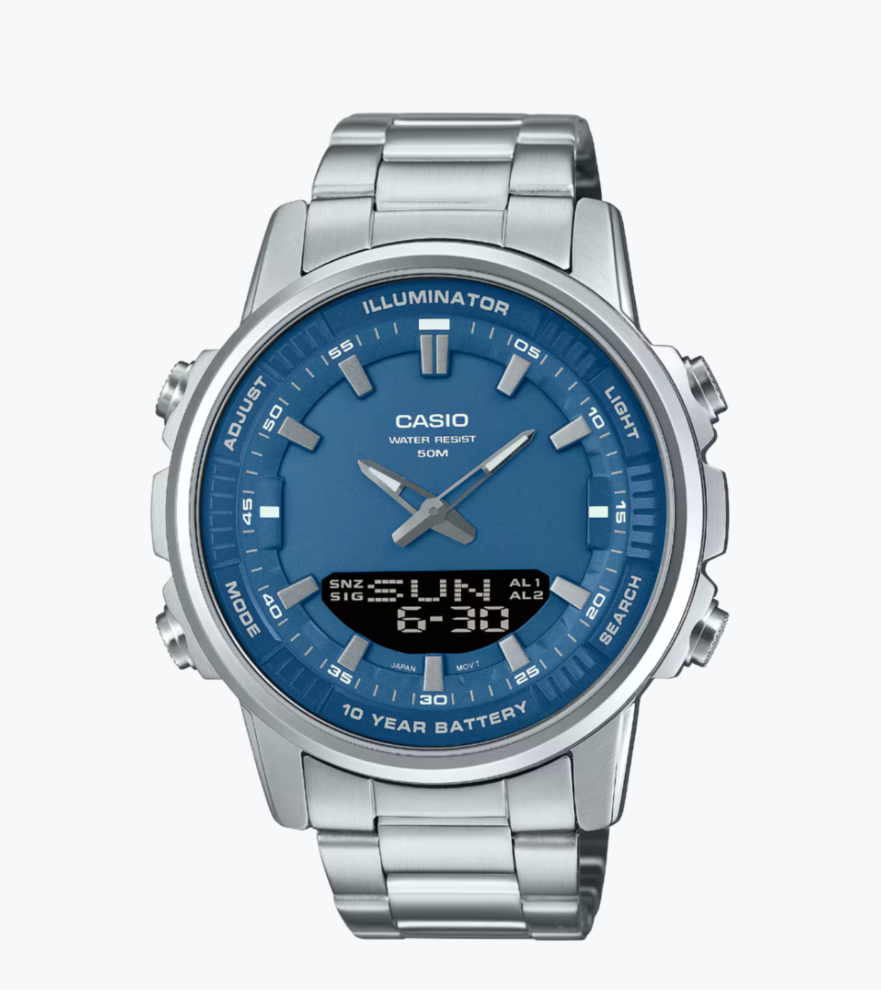 رقمي: الساعات، الدقائق، الثواني، صباحي/مسائي، الشهر، التاريخ، اليوم