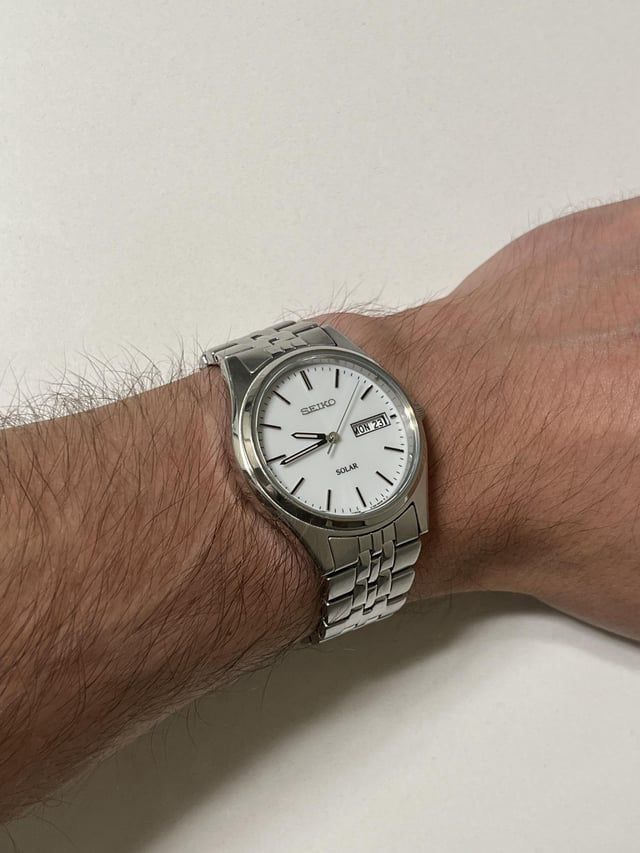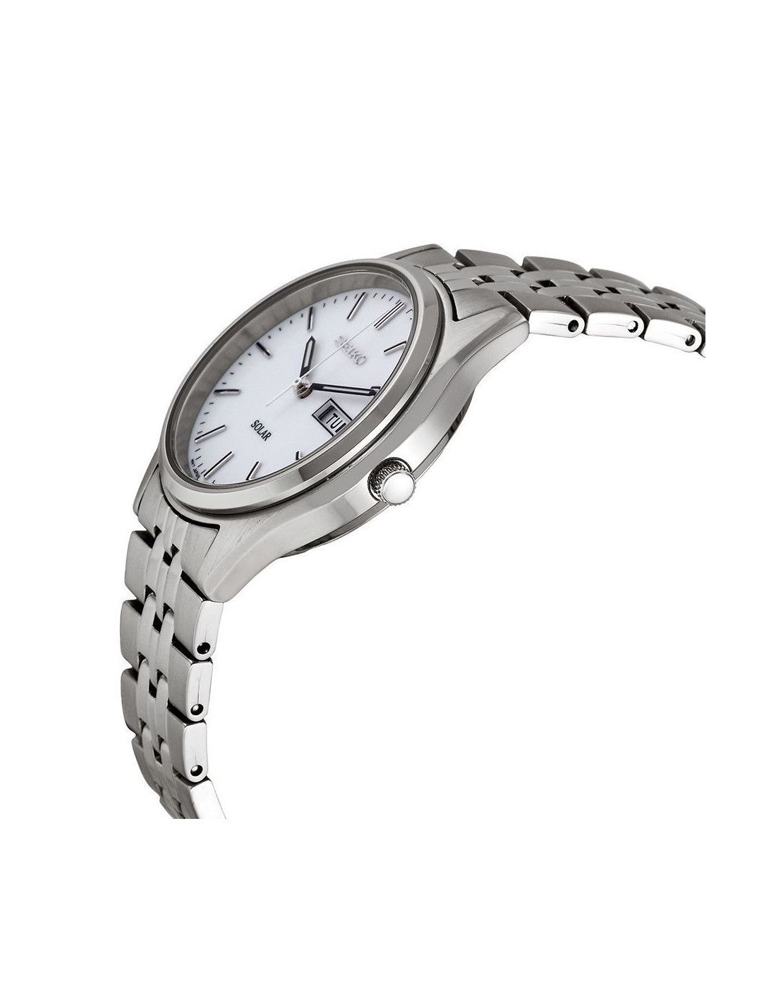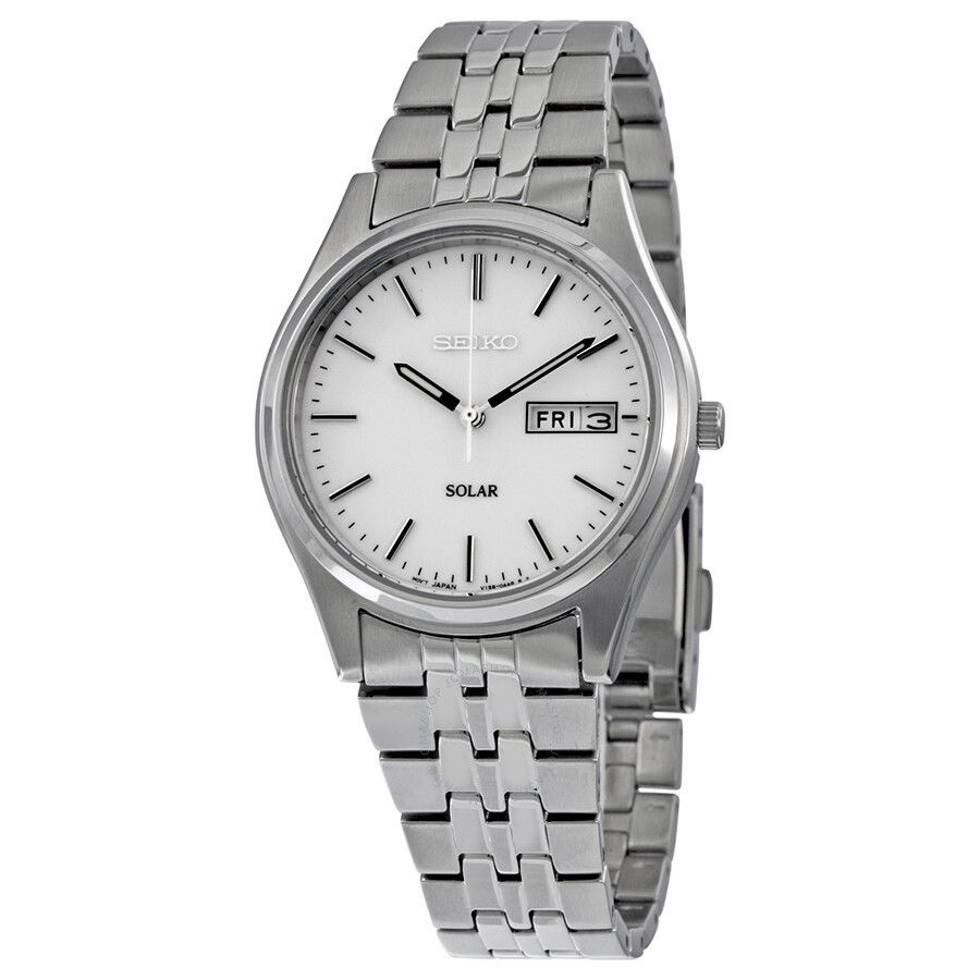 - Seiko SNE031 Mens Watch Stainless Steel Solar Quartz Link Bracelet White Dial Brand Seiko Model number SNE031 Part Number SNE031 Model Year 2011 Item Shape Round Dial window material type Hardlex Display Type Analog Clasp Deployment clasp with push-button Metal stamp none Case material Stainless steel Case diameter 37.00 Case Thickness 10.00 Band Material Stainless steel Band length Men’s Standard Band width 18 millimeters Band Color Silver Dial color Silver Bezel material Stainless steel Bezel function Stationary Calendar Day and date Special features solar Movement Quartz Water resistant depth 99 Feet